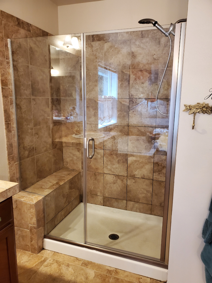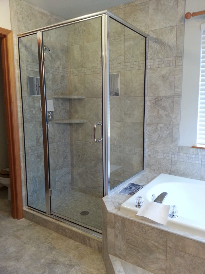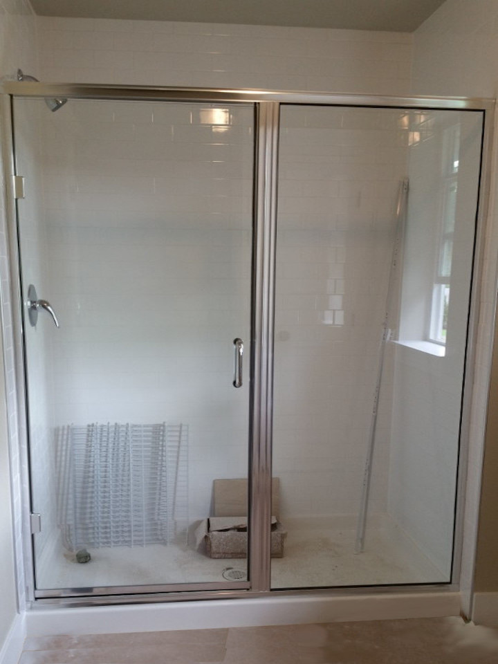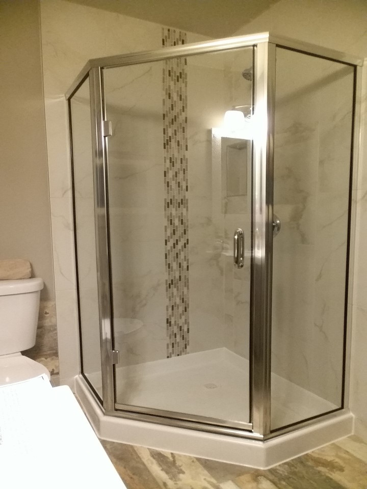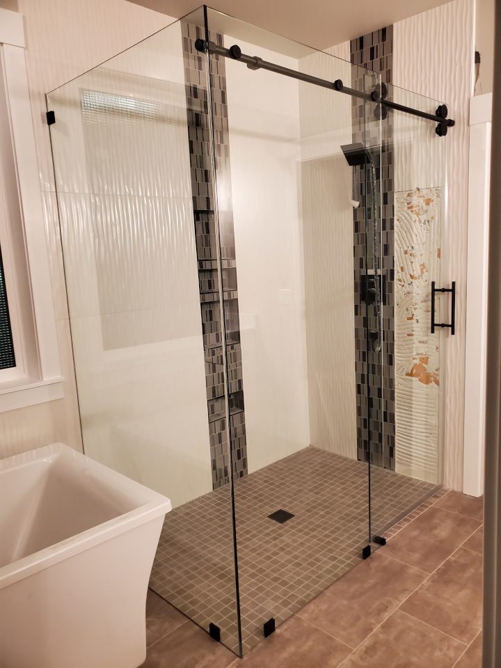 1/4” Semi-Frameless Door with 3/16” Sidelite Panels. Euro headers, towel bars and continuous hinge. Handles and hardware securely attached through holes in the glass.