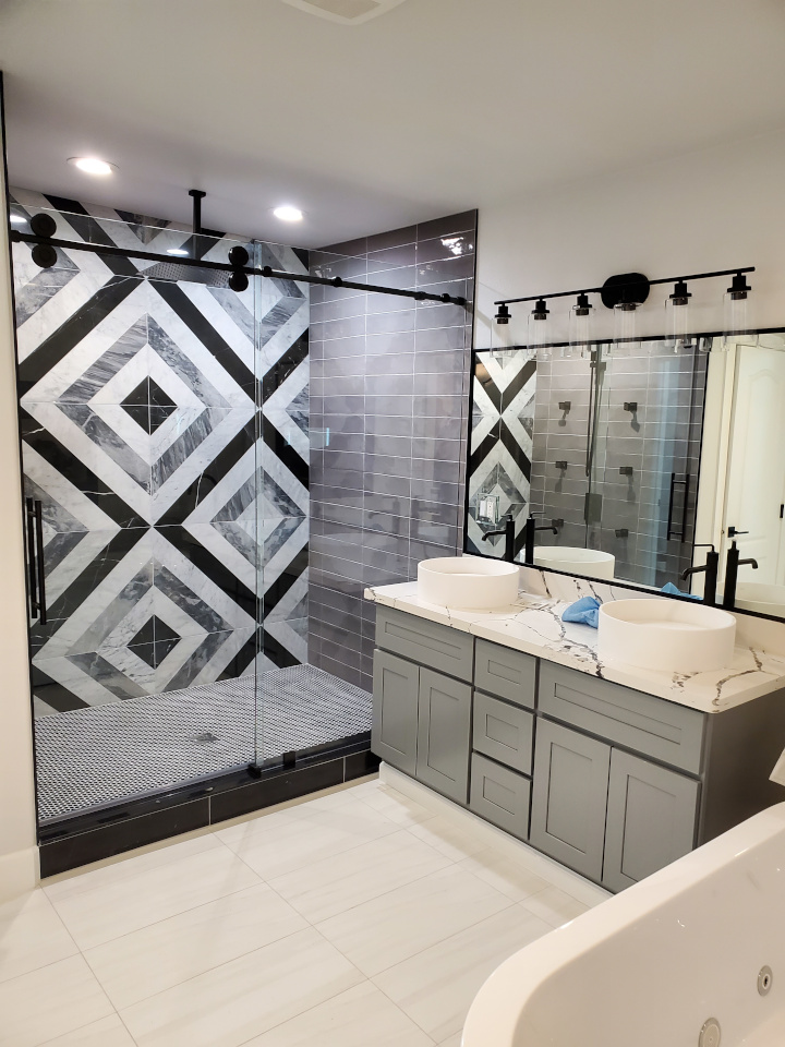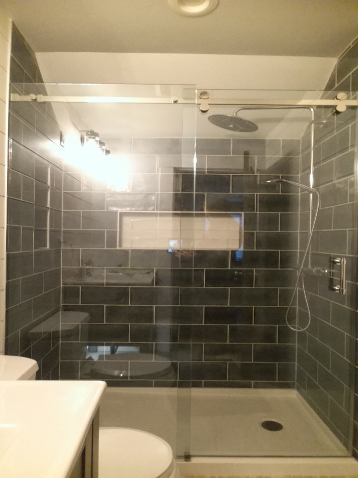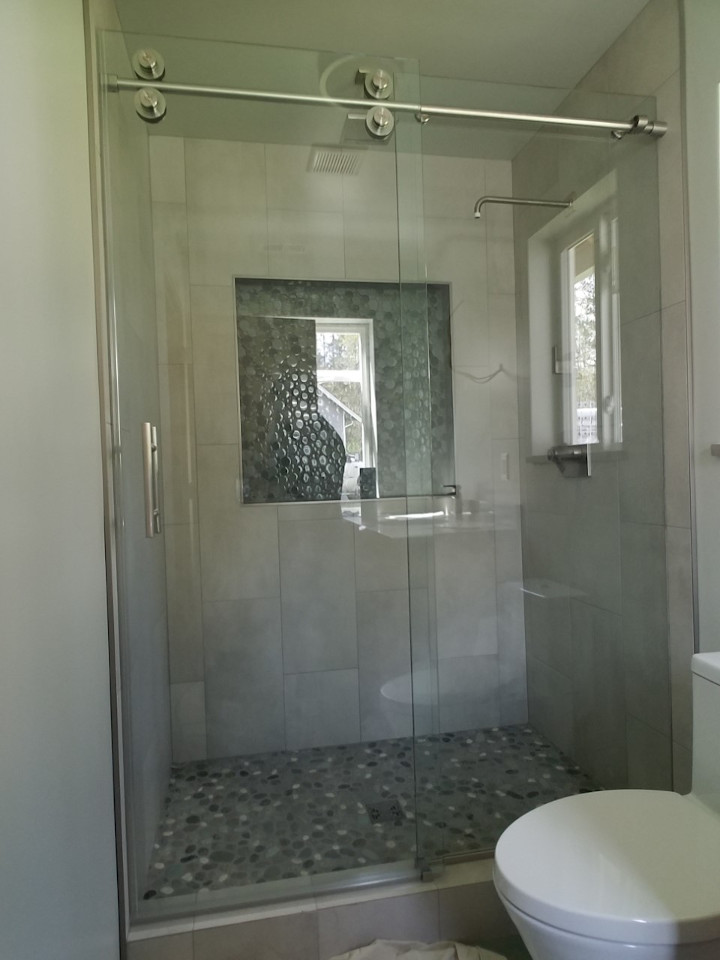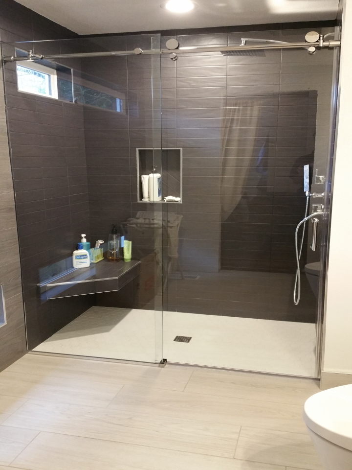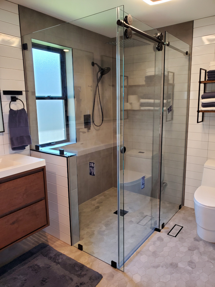 1/4” Semi-Frameless Door with 3/16” Sidelite Panels. Euro headers, towel bars and continuous hinge. Handles and hardware securely attached through holes in the glass.