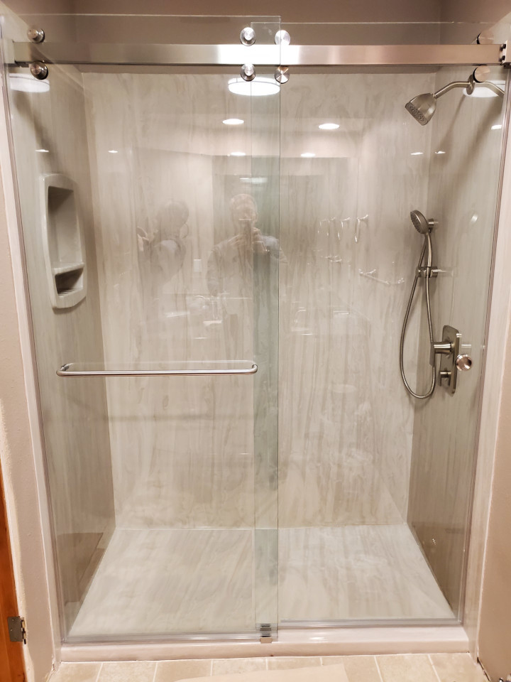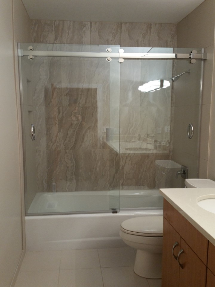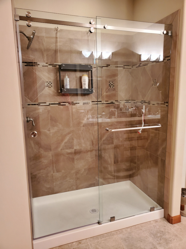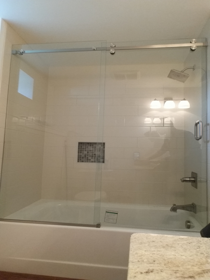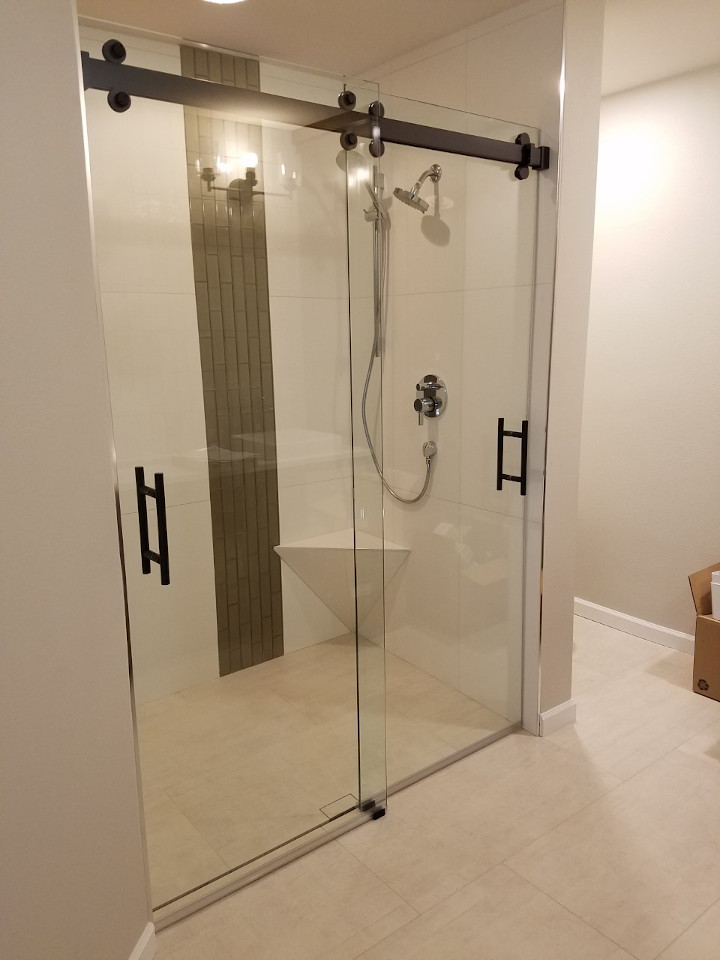 Tubular Header Frameless Barn Door Enclosures with Exposed Rollers & Headers. Features stainless steel bar and hardware. 3/8” and 1/2” single “barn door” slider available in the most popular configurations. Available as double bypassing slider in both shower and tub heights (3/8” glass only)